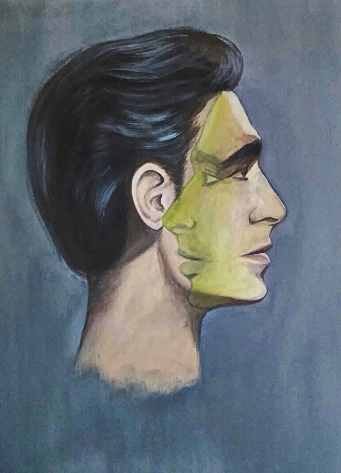 The idea of the picture is to show that man is a two-faced being. In life, people look at two worlds at the same time - the outer, material world and the inner, upper world. Acts in life, of course, will be verified by an internal judge. The source is inside and everything is checked with it. The material world is an alien world. We come to him and leave him. The inner world seems more familiar to us, because it is so. There we are relaxed, happy.